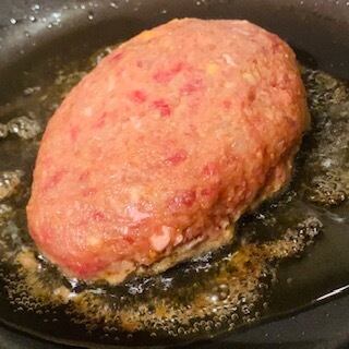 2)形を整えなおした生ハンバーグを入れ弱火でゆっくりと両面を焼きます。